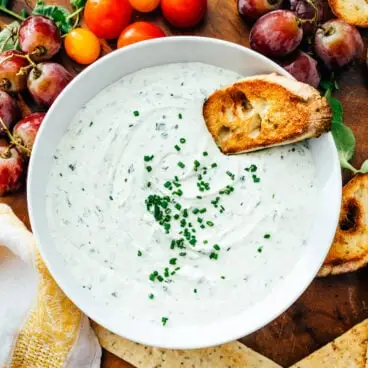Voici une trempette ou une tartinade rapide et crémeuse qui fera parler tout le monde : Fromage de Chèvre Fouetté ! Cet apéritif de fête ne prend que 5 minutes à préparer et a le goût d'un rêve ! Si vous aimez le crémeux terreux et savoureux du fromage de chèvre, vous vous garerez juste à côté du bol. Aromatisée aux herbes fraîches et à l'ail, cette tartinade onctueuse est idéale pour tremper des craquelins ou des crostini. Ajoutez-le à un plateau de légumes ou plateau de fromages pour une collation de fête parfaite. Nous l’avons fait pour mes parents et ils ne pouvaient s’empêcher de s’y plonger avec des bretzels.