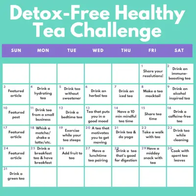 En fait, ce mois-ci sur Instagram, j'organise le Detox-Free Healthy Tea Challenge. Chaque jour, il y a un thé différent. Chaque jour comporte un défi lié au thé qui aidera votre santé d’une manière ou d’une autre. Si vous aimez la tâche, je vous encourage à continuer à la faire jusqu'à ce qu'elle devienne une habitude durable. Et si un jour la tâche ne vous plaît pas, ce n’est pas grave aussi ! Comme je l'ai dit, vous n'êtes pas obligé de tout faire. C'est pourquoi j'ai créé un mois complet de défis, afin que vous puissiez essayer différentes choses et continuer uniquement ce que vous aimez. Si vous nous rejoignez sur Instagram, assurez-vous de me taguer @ashleyteaandthings et d'utiliser le hashtag #detoxfreehealthytea. Je partagerai vos publications et vous encouragerai à poursuivre votre parcours de santé, aucune cure de désintoxication n'est nécessaire.